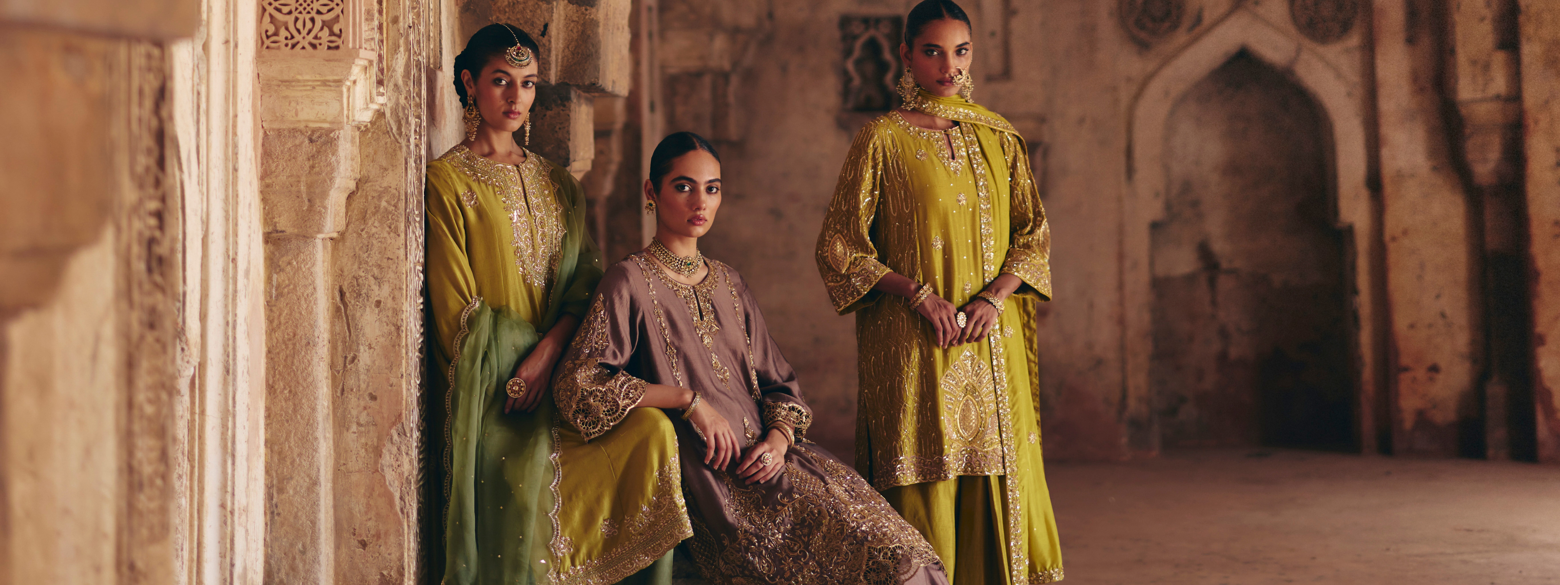 Immerse yourself in the soulful elegance of the Ruhani Suit Set, the vibrant artistry of the Rangrez Suit Set, the serene allure of the Saanjh Suit Set, and the regal grace of the Gulnaar Gharara Set. Each ensemble is thoughtfully crafted, blending delicate embellishments, rich fabrics, and refined silhouettes to narrate a story of grace and nostalgia.
