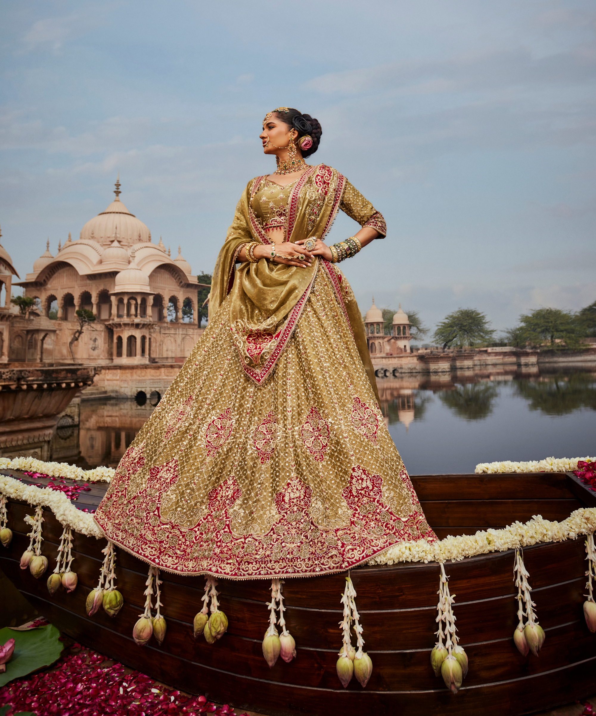 Each masterpiece narrates a story of grace and grandeur: the fiery allure of the Red Organza Lehenga, the ethereal shimmer of Golden Dusk, the fresh poetry of Birdsong Green, and the mysterious elegance of Twilight. Crafted for queens of today, these lehengas blend classic artistry with contemporary silhouettes, ensuring every twirl captures hearts and every moment feels majestic.